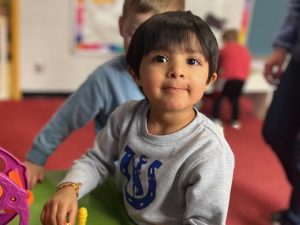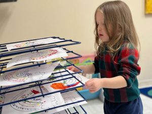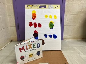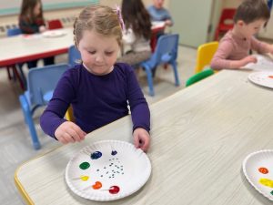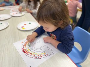 ‘R’ and painting a rainbow using Q-tips. We learned a song to memorize the colors of the rainbow to the tune of Twinkle Little Star and read a book called ‘Color Mix’ about making all the colors of the rainbow using red, blue, and yellow. Friday ended our week using Rhythm Sticks for Music and Movement time.