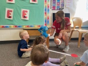 Top Dogs News- Miss E Exercise and her “E-e-e Exercisor” was with us this week. She had us exercise with her, brought us hard boiled eggs, erasers and elephants! We read lots of books about Elmer the elephant, elephants, erasers eggs, and engines. Our song of the week was “I’ve been working on the railroad” and our color is brown. We had a great time with our alumni visitors!