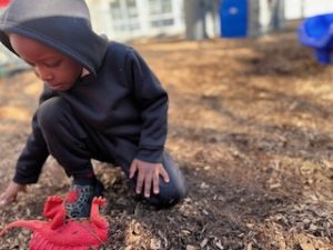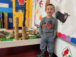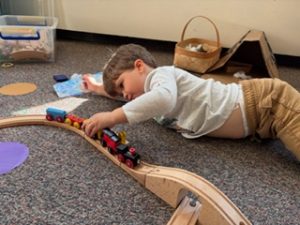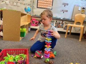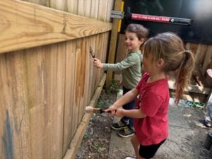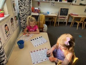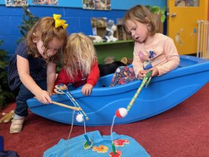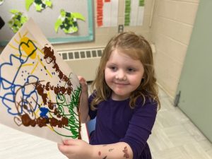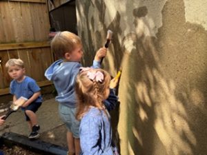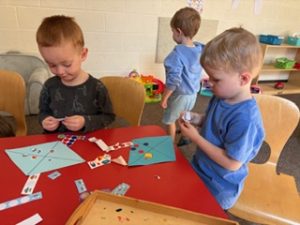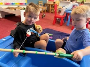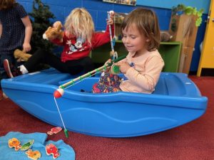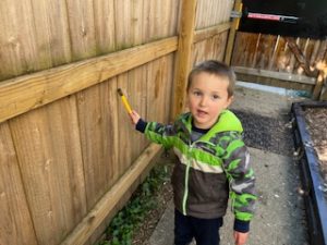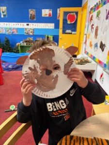 The Bunnies had such a fun week! We read We’re Going on a Bear Hunt by Michael Rosen many times during our camping theme, and this week we went on a real bear hunt! It was so much fun – going through the grass, river, mud, forest, snowstorm, and cave to get to a bear!! We also talked about the weather, graphed it and read some fun weather books. During craft time, we painted campfires with our hands, painted a bear mask and used stickers to decorate a kite. Fun week!
